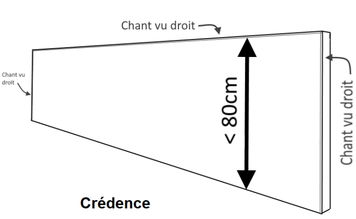 Crédence hauteur < 80cm, avec chant vu droit sur 1 longueur et 2 largeurs