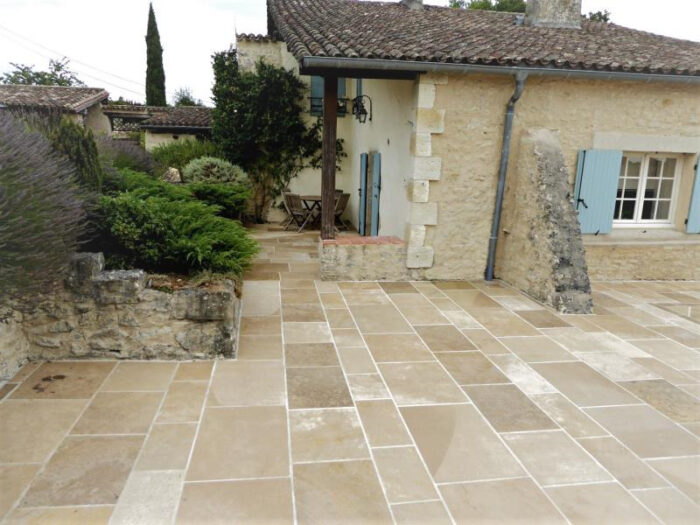 Dallage pierre naturelle Montagnac d’Auberoche B1 toutes nuances Brossé arêtes ébréchées bandes 30/40/50cm, épaisseur 2cm – Prix au m²