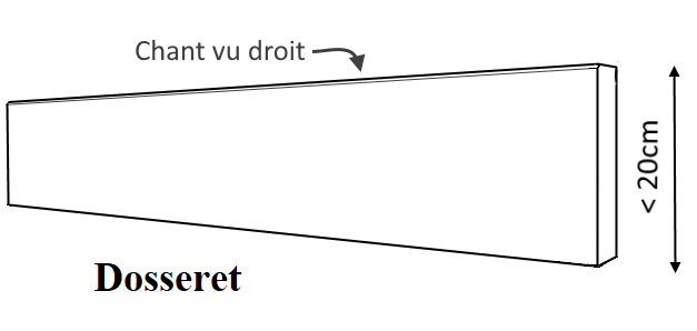 Dosseret hauteur < 20cm, avec chant vu droit sur 1 longueur. Epaisseur < 2cm