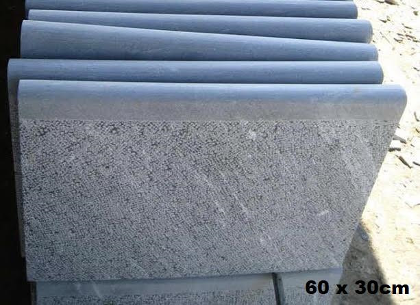 Margelle Blue Stone bouchardé 60x30cm chant vu 1/2 rond, épaisseur 3cm – Prix au ml