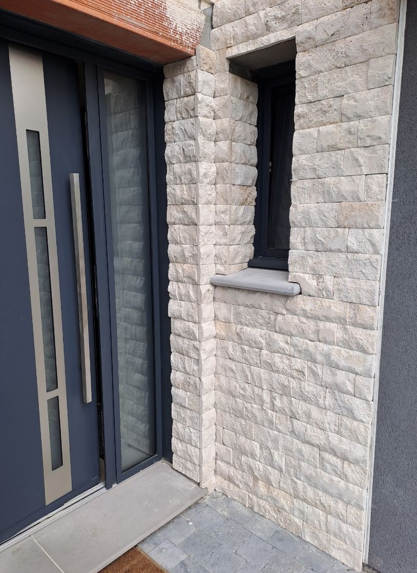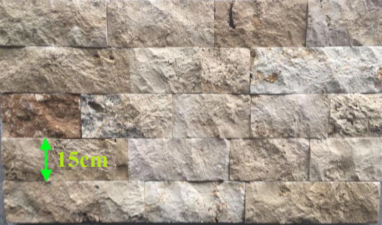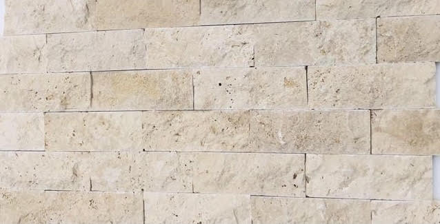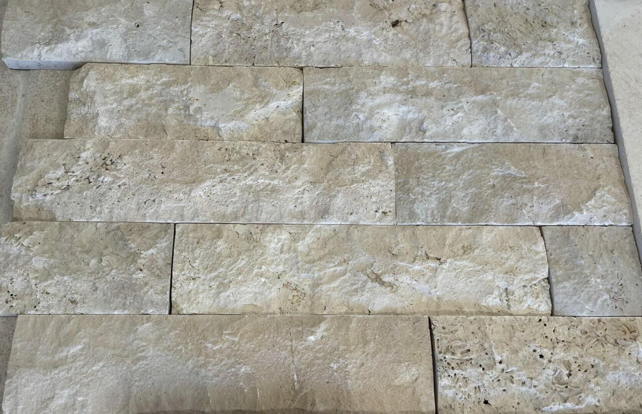 Parement mural en pierre Travertin face naturelle bande hauteur d’assise 15cm, épaisseur 2 à 2,2cm – Prix au m²
