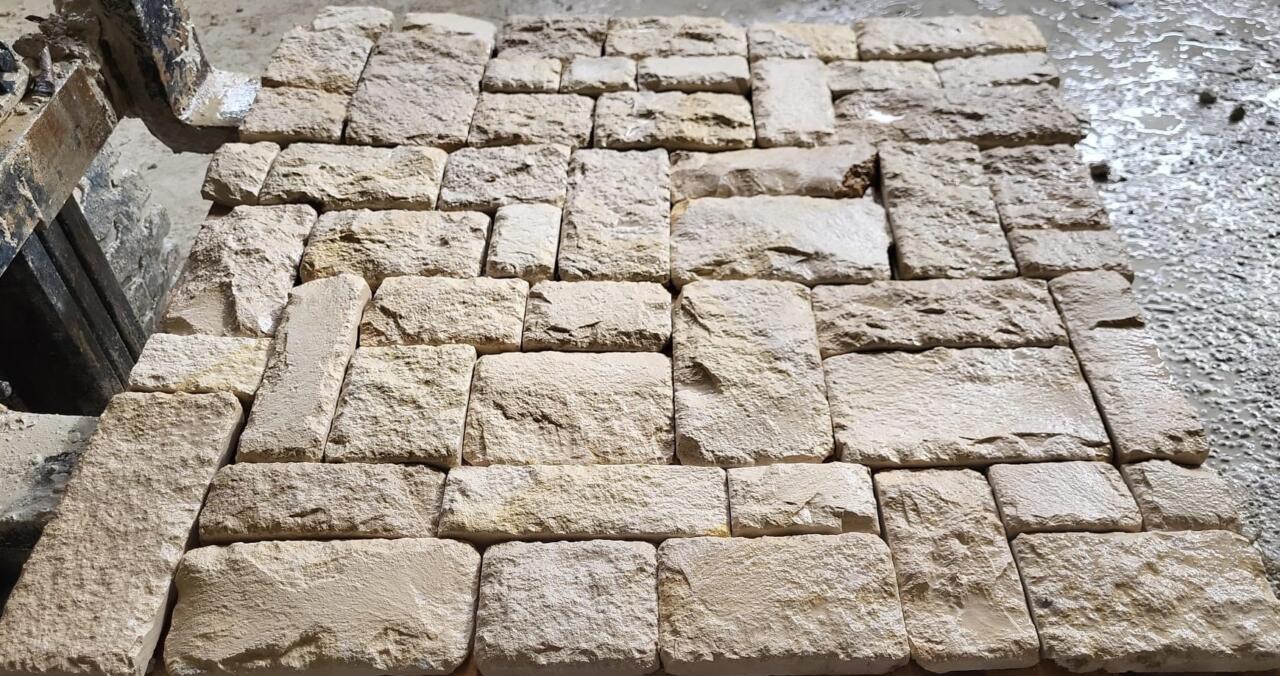Parement Opus Romain Montagnac d’Auberoche B1 et B2 toutes nuances. Face et arêtes éclatées, face arrière sciée pour collage, épaisseur +/- 2 à 4cm – Prix au m²