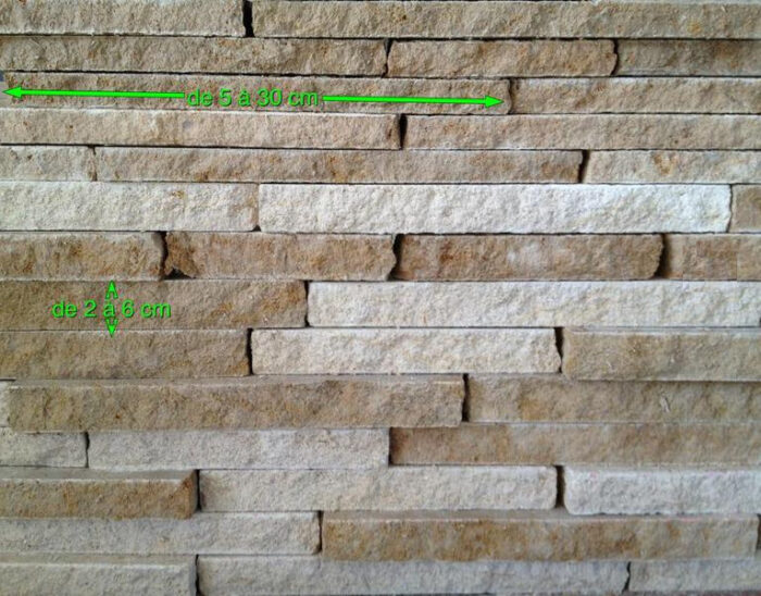 Parement pierre face éclatée. Longueur 5 à 30cm Hauteur d’assise 2 ou 3 ou 4 ou 5 ou 6cm Queue (épaisseur du mur) 3 à 4cm – Prix au m²