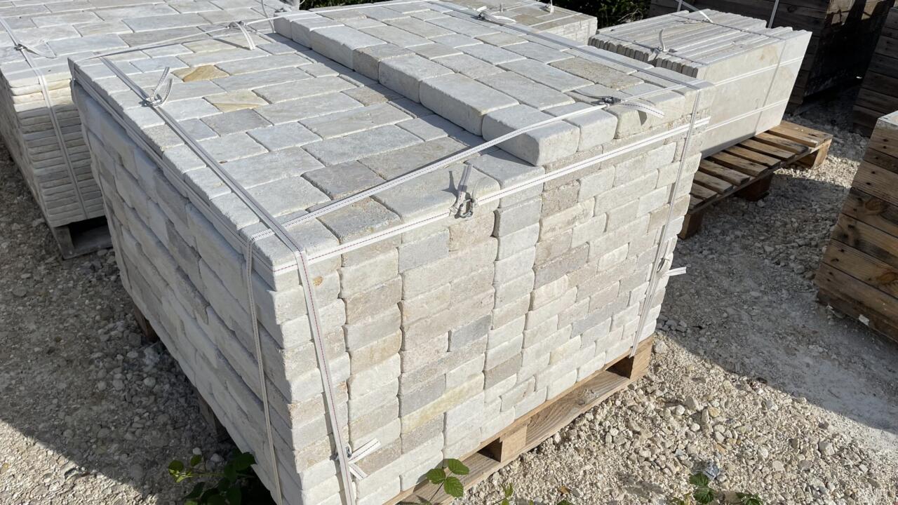 Pavé ANTICA© FIN en Pierre de France toutes nuances Beige et Gris, Bandes 15cm, épaisseur 2cm – Prix au m²
