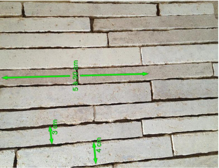 Pierre de Parement face plate et arêtes légèrement ébréchées Longueur 5 à 30cm Hauteur d’assise 3 et 4cm Queue (épaisseur du mur) 2cm – Prix au m²