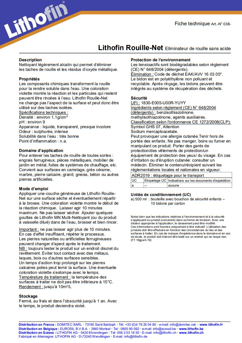 Lithofin Rouille-Net est un nettoyant légèrement alcalin conçu pour éliminer efficacement les taches de rouille et les résidus d’oxydes métalliques sur de nombreuses surfaces. Son action chimique transforme la rouille en éléments solubles dans l’eau, signalée par une coloration violette temporaire, facilement rinçable.
