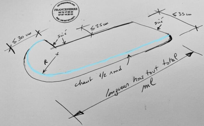 Semelle avec 1 côté arrondi + entaille en « L » < 180cm x < 60cm, épaisseur 3cm – Prix au ml
