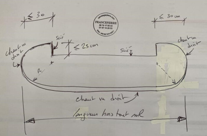 Semelle avec 1 côté arrondi + entaille « U » chant droit < 200x < 60cm – Prix au ml