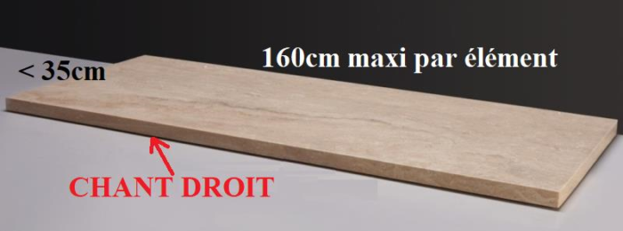 Semelle droite, seuil, couvertine, appui. Chant droit sur 1 longueur. Longueurs 160cm maxi par élément, largeur < 35cm, épaisseur 3cm (26 kg/ml). En pierre naturelle. Finition égrésée ou adoucie. Chant vu droit = chanfreiné 3mm dessus / dessous. Si < 1ml = compté pour 1ml