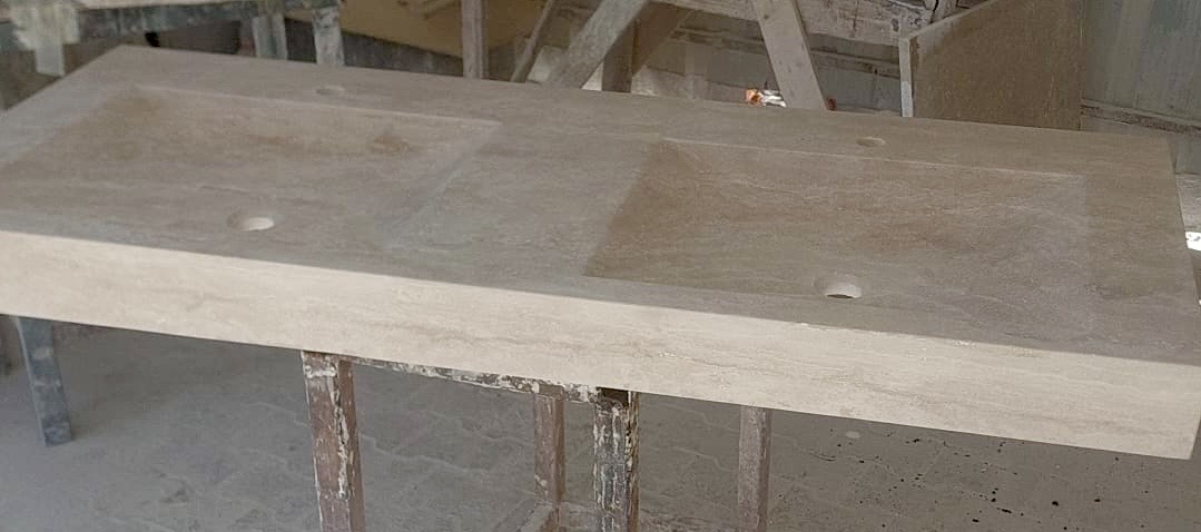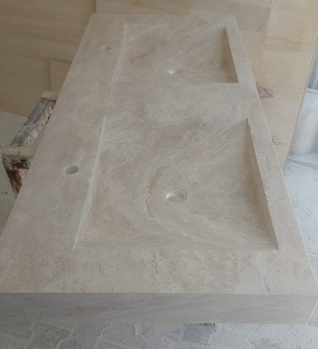 VASQUE DOUBLE « PICPUS » TRAVERTIN Beige Clair en pierre naturelle avec 2 trous robinetterie < 140 x < 60cm. Epaisseur 10cm