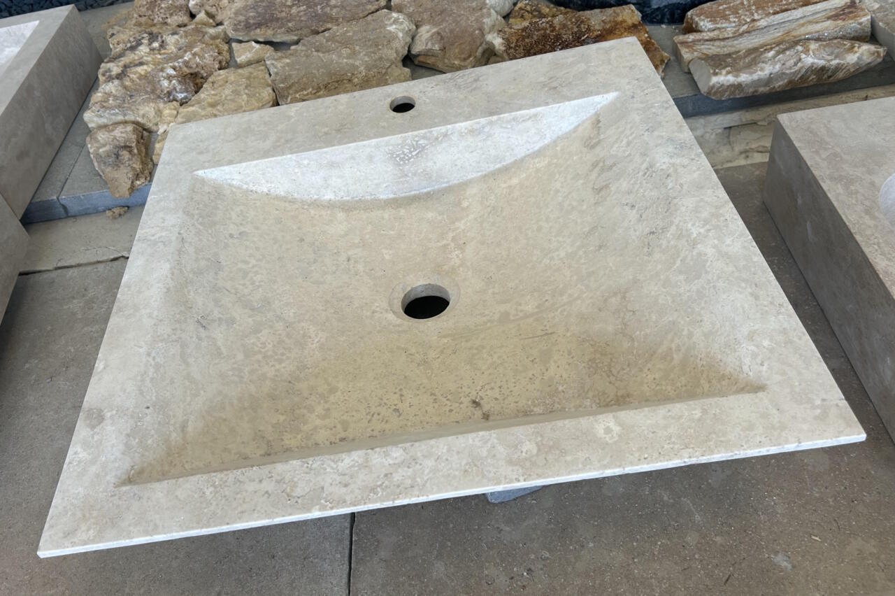 Vasque Travertin Petit New-York 50x50cm, épaisseur 10cm avec trou robinetterie