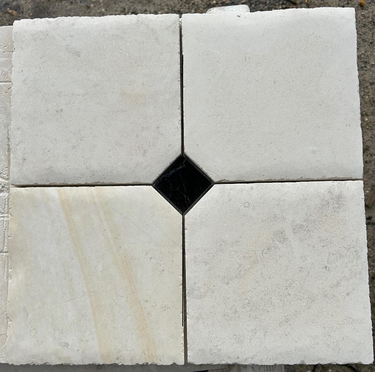 VIEILLE DALLE ANTIQUE DU PÉRIGORD MONTAGNAC CRÈME Vieillie et patinée à la main 30 x 30cm Avec 4 pans coupés par dalle + cabochon noir – Prix au m²
